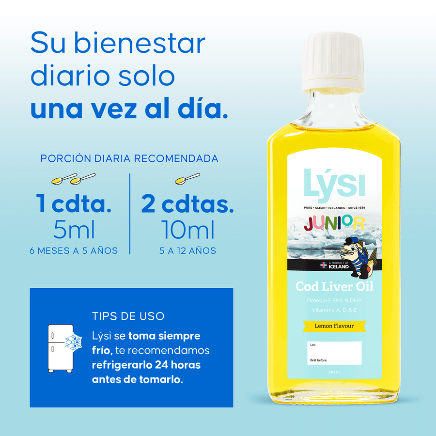 Sigue los consejos de pediatras en Islandia, que recomiendan introducir Lýsi en la dieta de los niños desde los 6 meses de edad o cuando empiecen a consumir comida solida.