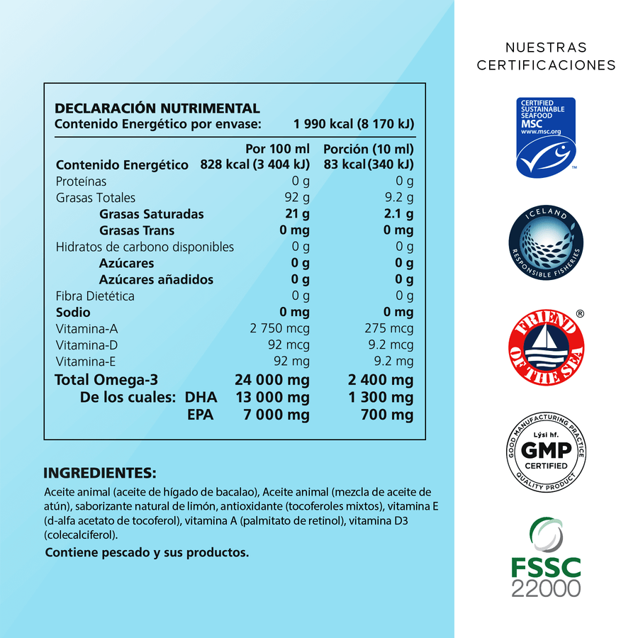 Este producto contiene pescado y productos pesqueros. Producto libre de mercurio, toxinas y contaminantes.