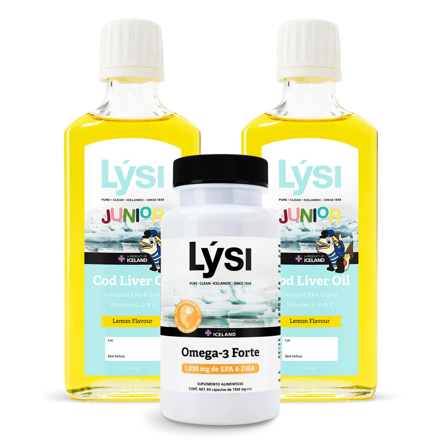 El paquete ideal para mamá e hijos, 1 cápsulas Lysi Omega-3 Forte para una mamá fuerte y sana, y 2 Lýsi Junior para impulsar el desarrollo de los pequeños del hogar.