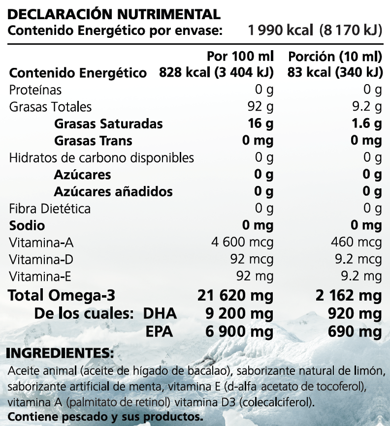 Este producto contiene pescado y productos pesqueros. Producto libre de mercurio, toxinas y contaminantes.