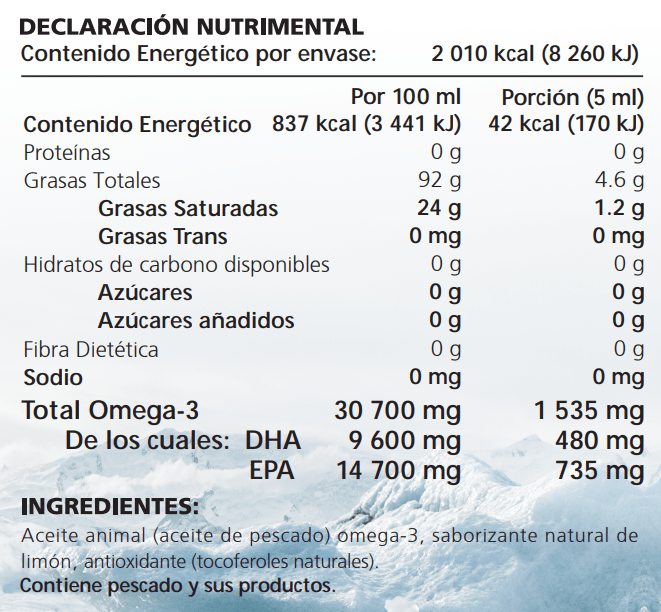 Este producto contiene pescado y productos pesqueros. Producto libre de mercurio, toxinas y contaminantes.