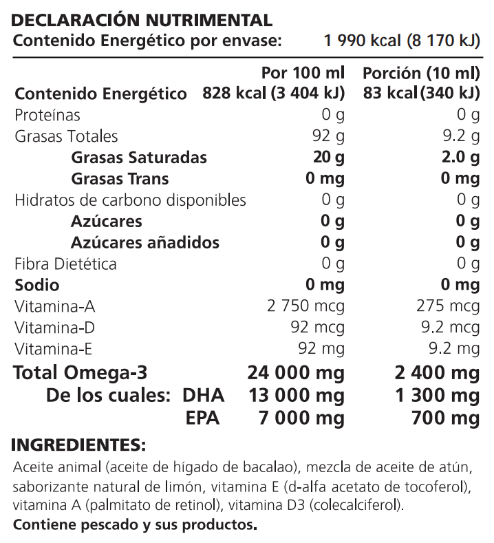 Este producto contiene pescado y productos pesqueros. Producto libre de mercurio, toxinas y contaminantes.